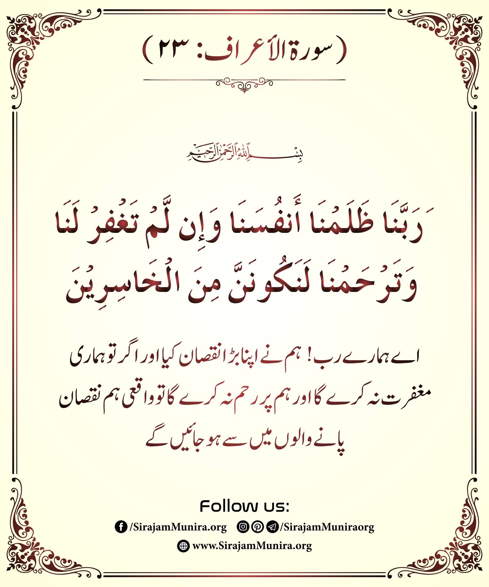 رَبَّنَا ظَلَمْنَآ أَنفُسَنَا وَإِن لَّمْ تَغْفِرْ لَنَا وَتَرْحَمْنَا لَنَكُونَنَّ مِنَ ٱلْخَـٰسِرِينَ