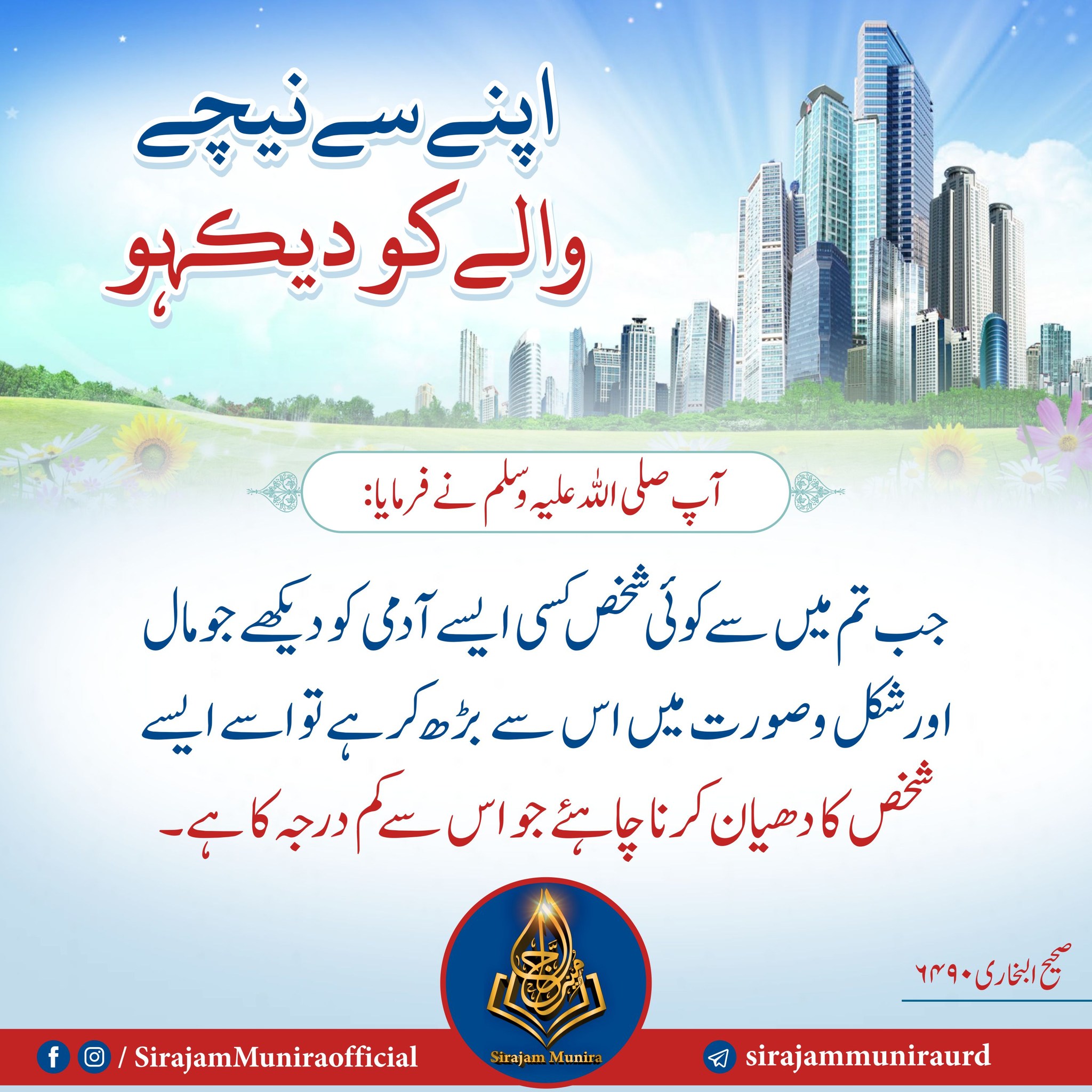 نبی کریم صلی اللہ علیہ وسلم نے فرمایا جب تم میں نے کوئی شخص کسی ایسے آدمی کو دیکھے جو مال اور شکل و صورت میں اس سے بڑھ کر ہے تو اسے ایسے شخص کا دھیان کرنا چاہئے جو اس سے کم درجہ کا ہے ۔