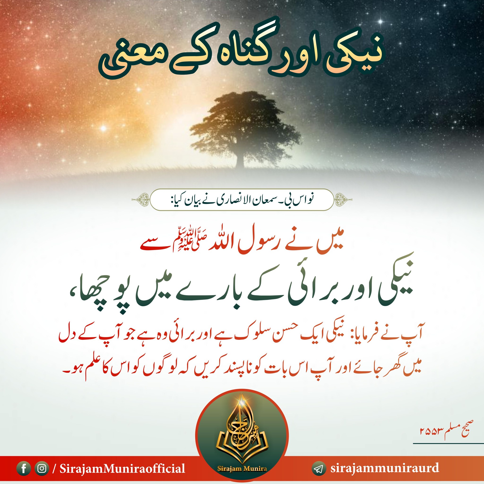 میں نے رسول اللہ ﷺ سے نیکی اور برائی کے بارے میں پوچھا، آپ نے فرمایا: نیکی ایک حسن سلوک ہے اور برائی وہ ہے جو آپ کے دل میں گھر جائے اور آپ اس بات کو ناپسند کریں کہ لوگوں کو اس کا علم ہو۔